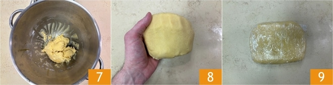 Você deve obter uma massa compacta e uniforme 7. Forme um disco 8, embrulhe em filme plástico 9 e deixe descansar na geladeira por pelo menos 3 horas.