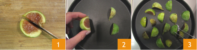 Para preparar os crostini de figos e Grana Padano, primeiro lave e divida os figos em quatro partes 1. Aqueça bem uma grelha, coloque os figos 2 e grelhe por cerca de 2 minutos 3, depois reserve.