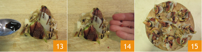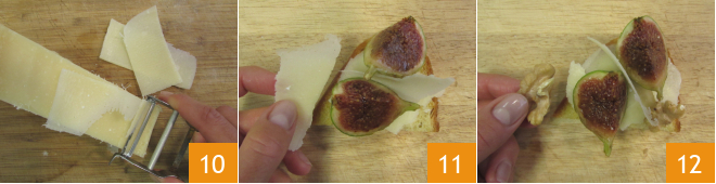 Por fim, faça lascas finas de Grana Padano DOP com a ajuda de um descascador de legumes 10. Você está pronto para montar seus crostini: coloque 2 quartos de figo em cada crostini, adicione algumas lascas de Grana Padano DOP 11 e um par de nozes 12.