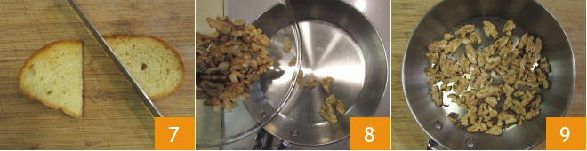 Divida as fatias de pão tostado ao meio 7. Agora coloque as nozes em outra frigideira bem quente 8 e toste-as por cerca de 2 minutos 9.