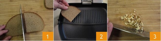 Para preparar os crostinis de figos, primeiro corte as fatias de pão ao meio 1 e toste-as em uma chapa bem quente 2. À parte, pique as nozes 3.