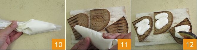 Transfira o creme para um saco de confeitar sem bico 10 e esprema-o sobre os crostinis tostados 11, depois coloque 3 fatias de figos em cada crostini 12