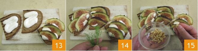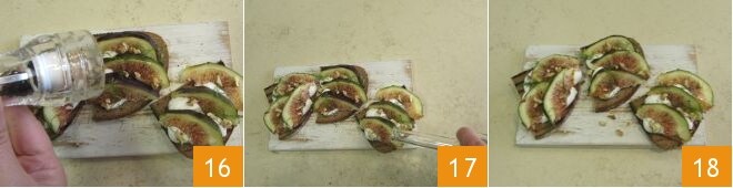Finalize com uma pitada de pimenta 16, um fio de azeite de oliva 17 e sirva imediatamente seus crostinis de figos 18.