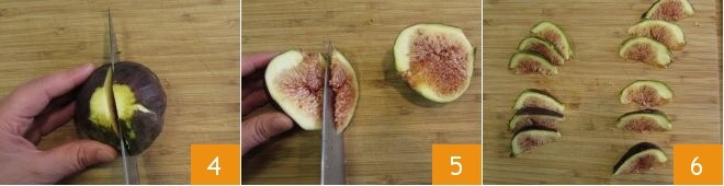 Lave e seque os figos, corte fora a parte superior 4 e divida cada metade em 6 fatias 5: assim você obterá 12 fatias de figos 6.