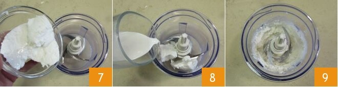 Agora prepare o creme: na tigela de um mixer, coloque a ricota 7, o creme de leite 8 e tempere com pimenta e sal. Bata tudo para obter um creme macio e homogêneo 9.