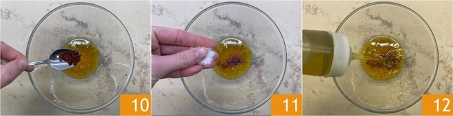 Adicione uma parte da pimenta rosa na tigela com a casca e o suco dos cítricos (ajuste a quantidade ao seu gosto) 10, depois salgue 11 e tempere com o óleo 12.