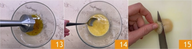 Emulsione com um mixer de imersão 13 para obter uma consistência densa e cremosa 14. Neste ponto, pegue as vieiras já abatidas e limpas e corte-as em fatias de meio centímetro de espessura 15.