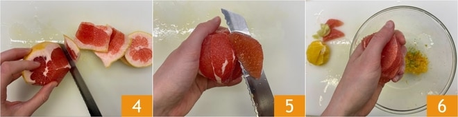 Agora descasque os cítricos a vivo: com uma faca, remova primeiro a casca e a parte branca 4, depois retire os gomos inserindo a lâmina entre as membranas 5. Por fim, esprema os restos dos cítricos na tigela com as cascas 6. Reserve.