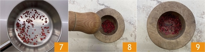 Toste levemente os grãos de pimenta rosa em uma frigideira 7, depois coloque-os em um pilão 8 e triture-os grosseiramente 9.