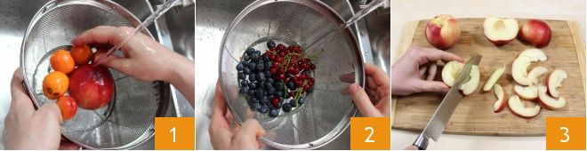 Para preparar a crumb cake com frutas de verão, comece pelas frutas: lave-as cuidadosamente em água corrente (1-2) e seque-as delicadamente com um pano. Tire as groselhas dos caules e reserve juntamente com os mirtilos. Em seguida, coloque os pêssegos em uma tábua e corte-os ao meio, retire o caroço e corte-os em fatias 3.