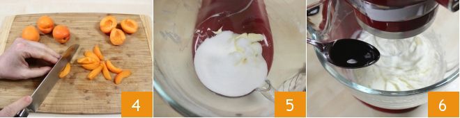 Repita a operação com os damascos: corte-os ao meio, retire o caroço e corte-os em fatias 4. Para evitar que as frutas cortadas fiquem escuras, transfira-as para uma tigela e regue com suco de limão. Cubra a tigela com filme plástico e mantenha em local fresco até o momento de usá-las. Agora prepare a massa: coloque a manteiga em temperatura ambiente na tigela de uma batedeira junto com o açúcar 5 e bata até obter uma mistura cremosa e espumosa; se não tiver uma batedeira, use um batedor elétrico ou um fouet. Adicione o extrato de baunilha 6, em substituição pode usar 1 sachê de vanilina ou uma fava de baunilha. Adicione uma pitada de sal e continue batendo.