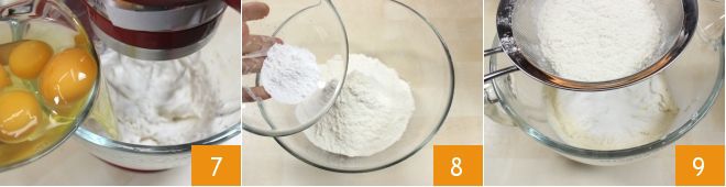 Continuando a bater, adicione um a um os ovos em temperatura ambiente 7 e continue por mais 2-3 minutos. Após este tempo, misture o fermento e a farinha 8 e incorpore-os, peneirando-os, à mistura de manteiga e açúcar 9. Em seguida, misture tudo com uma espátula, até que a consistência da mistura seja semelhante à de uma massa de bolo.