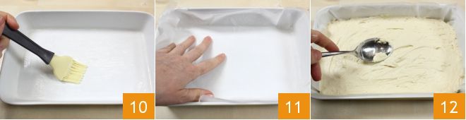 Unte uma assadeira retangular de 20x30 cm com a ajuda de um pincel 10 e forre-a com papel manteiga 11, para saber como realizar melhor esta operação, consulte a Escola de Culinária: como forrar uma forma com papel manteiga. Neste ponto, despeje a massa dentro da assadeira e nivele com as costas de uma colher 12.