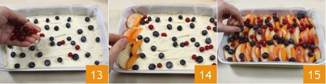 Agora pegue as frutas lavadas e cortadas em fatias que você havia reservado. Espalhe sobre a superfície metade dos mirtilos e metade das groselhas 13, depois prossiga dispondo as fatias de pêssegos e damascos de forma aleatória ou em fileiras alternadas 14 e finalize adicionando a outra metade das groselhas e mirtilos 15.