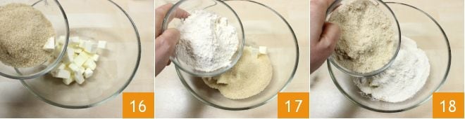 Prepare agora o crumble: em uma tigela coloque a manteiga fria cortada em cubos e adicione o açúcar mascavo 16. Adicione também a farinha de trigo 17 e a farinha de amêndoas 18.
