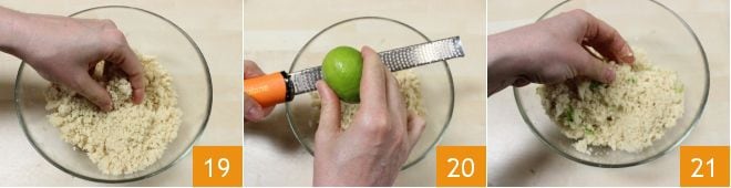 Misture com a ponta dos dedos, tentando incorporar tudo esfarelando-o e sem insistir muito para não derreter a manteiga e adicione duas grandes pitadas de sal 19. Rale a casca de um limão na mistura 20 e continue misturando com a ponta dos dedos 21.
