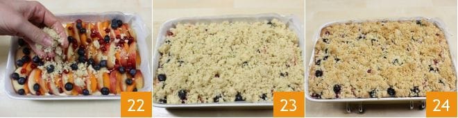 Transfira o crumble para a camada de frutas 22 de maneira uniforme 23 e leve ao forno estático pré-aquecido a 180° por cerca de 60 minutos, se usar forno ventilado, asse a 160° por 50 minutos. Quando a camada de migalhas estiver ligeiramente dourada, sua crumb cake com frutas de verão estará pronta 24. Retire do forno e deixe esfriar, depois corte em cubos ou fatias retangulares. Você pode servir sua crumb cake com frutas de verão acompanhada de uma bola de sorvete de baunilha ou de creme ou com chantilly levemente adoçado!
