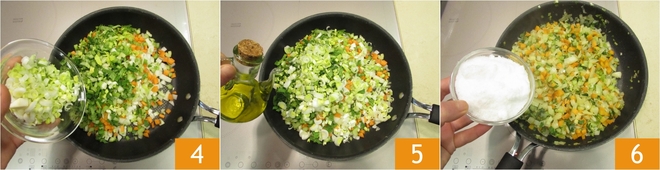 Adicione também o salsão e o alho-poró 4. Tempere com o óleo 5 e cozinhe por cerca de 15 minutos. Neste ponto, adicione o sal fino 6.