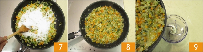 Continue cozinhando por cerca de 5-6 minutos, mexendo de vez em quando 7. Agora que os vegetais estarão murchos e bem saborosos 8, transfira-os para um processador 9.
