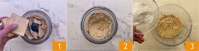 Para preparar os cubos de coco e chocolate, primeiro derreta a manteiga em uma panela pequena e deixe esfriar. Enquanto isso, coloque os biscoitos secos dentro do processador 1 e triture até reduzi-los a pó 2. Transfira tudo para uma tigela e adicione o coco ralado 3.