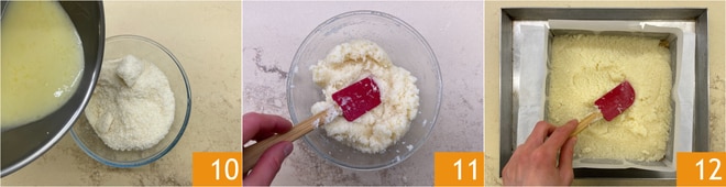 Quando a mistura estiver quase fervendo, despeje sobre o coco ralado que você colocou em uma tigela 10, depois misture até obter uma mistura homogênea 11. Transfira a mistura para a forma e pressione bem para formar uma camada compacta e uniforme 12. Deixe descansar na geladeira por mais 5 minutos.