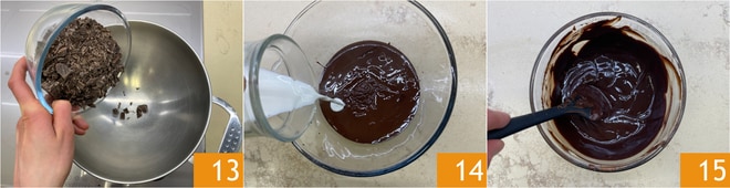 Enquanto isso, prepare a cobertura: pique o chocolate amargo e derreta em banho-maria (ou no micro-ondas) 13, depois transfira para uma tigela. Em uma panela à parte, leve o creme de leite quase à fervura, depois adicione ao chocolate derretido 14 e misture bem 15. Deixe esfriar.