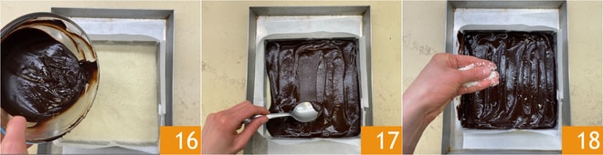 Retire a forma da geladeira, despeje a ganache esfriada sobre a camada de coco 16 e alise com uma colher 17. Por fim, polvilhe com coco ralado 18. Coloque na geladeira por pelo menos 4 horas.
