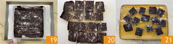 Após o tempo de resfriamento, desenforme o doce e retire o papel manteiga 19, depois corte em pedaços de forma quadrada 20. Seus cubos de coco e chocolate estão prontos para serem saboreados 21!