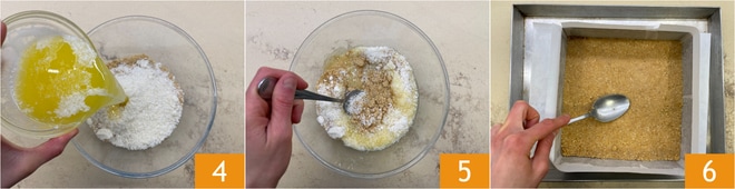 Despeje a manteiga derretida e esfriada 4 e misture 5 até obter uma mistura arenosa. Despeje em uma forma de 20x20 cm forrada com papel manteiga e pressione com as costas de uma colher para nivelar e compactar 6. Deixe descansar na geladeira por 5 minutos.