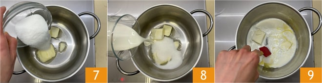 Enquanto isso, prepare o recheio de coco: em uma panela em fogo baixo, misture a manteiga, o açúcar 7, o creme de leite 8 e mexa para derreter bem a manteiga 9.