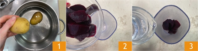 Para preparar os culurgiones de beterraba com batatas e molho de queijo azul, primeiro cozinhe as batatas começando com água fria; levará cerca de 30-40 minutos, dependendo do tamanho 1. Enquanto isso, prepare a massa: descasque as beterrabas pré-cozidas e coloque-as em um copo 2 junto com a água 3.