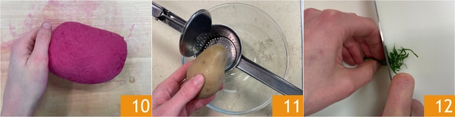 Quando você tiver obtido um bloco liso, elástico e homogêneo 10, envolva-o em filme plástico e coloque-o na geladeira para descansar por pelo menos 30 minutos. Enquanto isso, as batatas estarão cozidas, então amasse-as em uma tigela 11. Corte as folhas de hortelã em tiras bem finas 12.