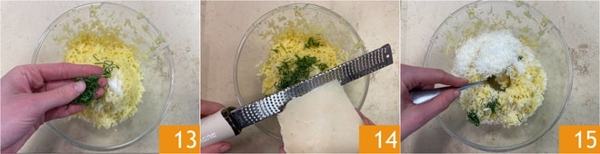 Adicione a hortelã às batatas amassadas 13 junto com uma pitada de sal e o pecorino ralado 14. Misture bem para combinar os ingredientes 15 e reserve.
