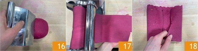 Retome a massa e divida-a ao meio 16, cuidando para envolver em filme plástico a parte que você não vai utilizar para evitar que resseque. Achate ligeiramente a massa com as mãos e comece a esticá-la com a máquina de massa começando com a espessura maior 17. Dobre a massa ao centro 18 e passe várias vezes, reduzindo gradualmente a espessura.