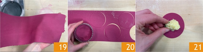 Quando você tiver obtido uma folha com espessura de 2 mm 19, corte discos usando um cortador de 10 cm de diâmetro 20. Você pode amassar os restos e estender novamente após um breve descanso. Coloque uma bolinha de recheio no centro de cada disco 21.