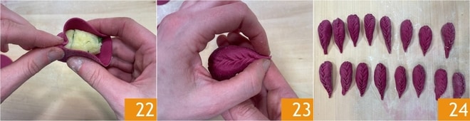 Dobre o disco ao meio e belisque as bordas começando de uma extremidade 22 até chegar à outra, selando o recheio dentro 23; é normal que no final saia uma pontinha de recheio. À medida que você forma os culurgiones, coloque-os na superfície de trabalho levemente polvilhada com sêmola 24 e reserve por um momento.