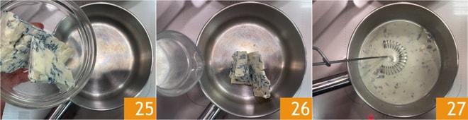 Finalmente, dedique-se ao fondue: em uma panela, adicione o roquefort 25 e o leite 26, depois acenda o fogo em chama baixíssima e mexa com um batedor até que o queijo esteja completamente derretido 27.