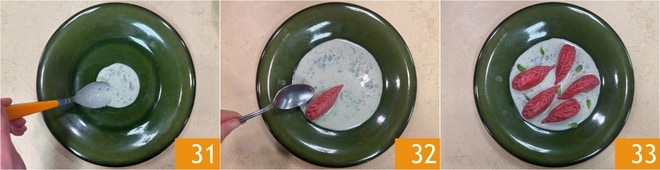 Distribua o molho de roquefort na base do prato 31, depois disponha os culurgiones 32 e decore com as folhas de hortelã. Seus culurgiones de beterraba com batatas e molho de queijo azul 33!