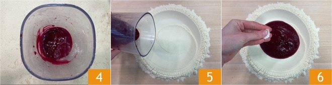 Bata com um mixer de imersão para obter um purê liso e homogêneo 4. Disponha a sêmola em uma superfície em forma de montanha, depois despeje o purê de beterraba no centro 5 e adicione uma pitada de sal 6.