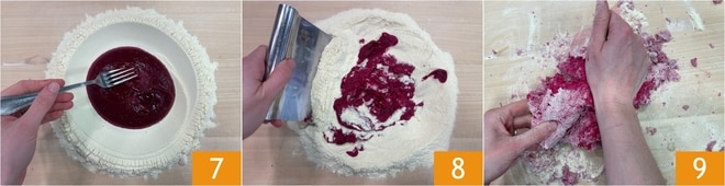 Comece a incorporar a farinha misturando com um garfo 7, depois continue com um raspador 8 e, por fim, trabalhe a massa com as mãos 9.
