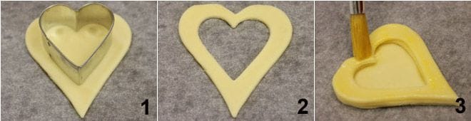 Para preparar os corações de massa folhada, comece pré-aquecendo o forno a 200°, desenrole a massa folhada e com um cortador em forma de coração, recorte 24 corações, deixando 8 inteiros, enquanto os 16 restantes fure com um cortador de coração de tamanho menor (1-2). Sobreponha dois corações furados sobre cada coração interno, cuidando de pincelar a superfície de cada camada para aderirem bem as bordas 3. Pincele bem também a última camada de massa folhada e leve os corações ao forno por cerca de 10 minutos. Retire os corações de massa folhada do forno e deixe esfriar sobre uma grade. Agora é hora de decorar seus coraçõezinhos: aqui estão nossas sugestões (as quantidades indicadas para cada recheio são suficientes para 4 coraçõezinhos).