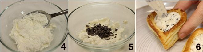 Para o recheio com ricota e chocolate, bata a ricota com o açúcar de confeiteiro e a colher de chá de creme de leite 4 até obter uma mistura cremosa, nesse ponto adicione as lascas de chocolate 5 misturando bem. Preencha os coraçõezinhos com o creme de ricota e chocolate 6 e cubra-os com lascas de chocolate que você reservou.