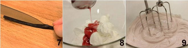 Para o recheio de amarena e chantilly, comece preparando o chantilly com os ingredientes acima indicados e Creme Chantilly para o procedimento 7. Uma vez pronto, adicione 4 colheres de sopa do xarope de amarena 8, continue batendo o creme 9 e preencha os coraçõezinhos. Para finalizar, corte ao meio as amarenas (ou, se preferir, deixe-as inteiras) e coloque-as sobre cada coraçõezinho para decorar. Feliz Dia dos Namorados!