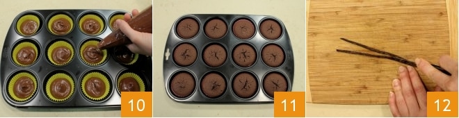 Transfira a massa para um saco de confeitar com bico liso e esprema dentro das forminhas de papel colocadas dentro de uma forma de muffin 10. Asse os cupcakes em forno estático pré-aquecido a 180° por 15 minutos (se forno ventilado a 160° por 10 minutos). Quando estiverem prontos, retire os cupcakes do forno e deixe esfriar 11. Enquanto isso, cuide do creme: corte ao meio a fava de baunilha 12 e retire as sementes,