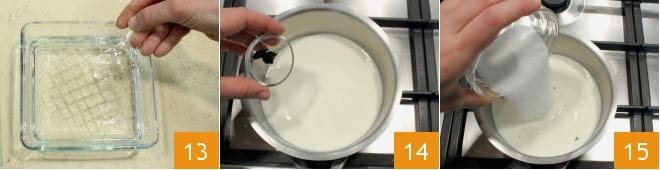 coloque as folhas de gelatina em uma tigela com água fria por cerca de 10 minutos para amolecê-las 13. Coloque o leite em uma panela e leve ao ponto de fervura, aromatize com as sementes da fava de baunilha 14, adicione o açúcar 15 e mexa para dissolver,