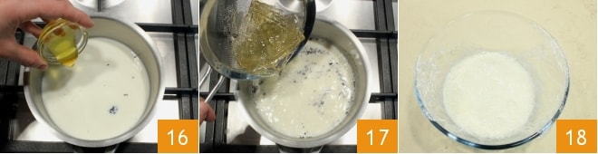 em seguida, adicione também o mel 16, misture novamente para incorporar os ingredientes e depois adicione a gelatina bem espremida 17, mexendo para dissolvê-la e espessar o creme, e então desligue o fogo, transfira para uma tigela, cubra com filme plástico em contato 18 e deixe esfriar. Coloque primeiro em temperatura ambiente e depois na geladeira por pelo menos algumas horas, para que esteja bem frio antes de adicionar o creme de leite batido. Antes de usá-lo, será adequado alisá-lo trabalhando por alguns instantes com o batedor.