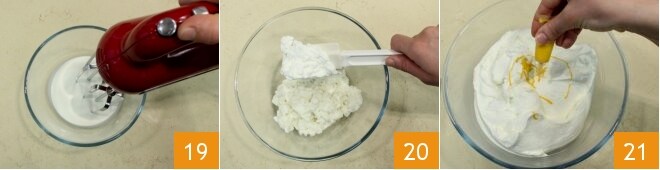 Após duas horas, pegue o creme de leite fresco e bata com a batedeira: deve ficar semi-batido 19, incorpore o creme de leite semi-batido ao creme frio e alisado com o batedor 20 e depois pegue o corante amarelo e coloque algumas gotas no creme 21, o suficiente para obter uma cor amarela vibrante.