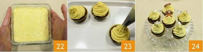 Cubra o creme amarelo com filme plástico em contato 22 e coloque na geladeira para firmar por cerca de duas horas. Quando o creme estiver bem firme e compacto, transfira para um saco de confeitar com bico estrelado e cubra os cupcakes com um generoso montinho de creme 23. Para finalizar, decore os cupcakes com as decorações de açúcar à vontade 24 ou até mesmo bolinhas de açúcar coloridas. Os cupcakes de mel decorados estão prontos para serem saboreados!