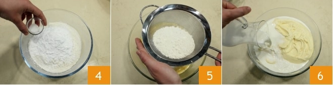 Em uma tigela à parte, coloque a farinha, a farinha de amido, depois adicione também o fermento e uma pitada de sal 4; peneire os ingredientes secos na tigela contendo a mistura de manteiga, açúcar e ovo 5 e misture com uma colher de pau para incorporar os ingredientes, depois adicione o leite em temperatura ambiente 6,