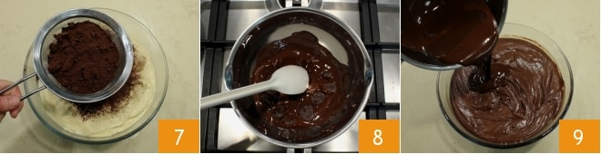 misture e por último adicione o cacau em pó 7. Em uma panela de banho-maria, derreta o chocolate amargo picado 8, adicione à mistura e misture para obter uma massa homogênea 9.